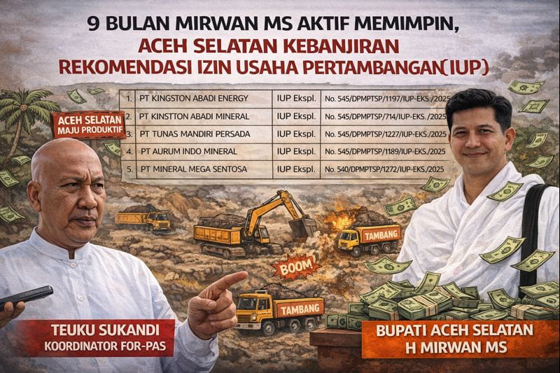 TAPAKTUAN – Dalam sembilan bulan kepemimpinan Bupati Aceh Selatan H Mirwan MS saat aktif menjabat, kebijakan yang paling menonjol justru datang dari sektor pertambangan. Forum Peduli Aceh Selatan (For-PAS) menilai daerah ini mengalami “banjir” rekomendasi Izin Usaha Pertambangan (IUP) eksplorasi, sebuah fenomena yang dinilai tidak sebanding dengan capaian pembangunan lain yang dirasakan langsung oleh masyarakat.