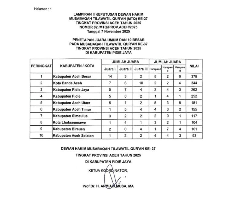 Dewan Hakim MTQ ke-37 Tingkat Provinsi Aceh menetapkan penilaian berdasarkan akumulasi peringkat juara dan harapan yang diraih masing-masing daerah. Penetapan hasil dituangkan dalam Keputusan Nomor 02/MTQ/PROV.ACEH/2025 yang ditandatangani langsung oleh Ketua Koordinator Dewan Hakim, Prof. Dr. H. Armia Musa, MA.