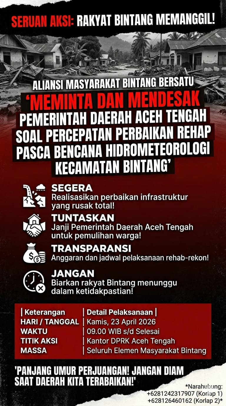 Aceh Tengah, 26 April 2026 — Aliansi Masyarakat Bintang Bersatu memutuskan untuk menunda rencana aksi unjuk rasa ke kantor DPRK Aceh Tengah. Keputusan tersebut diambil setelah mempertimbangkan kondisi terkini, di mana Bupati Aceh Tengah diketahui sedang tidak berada di daerah.