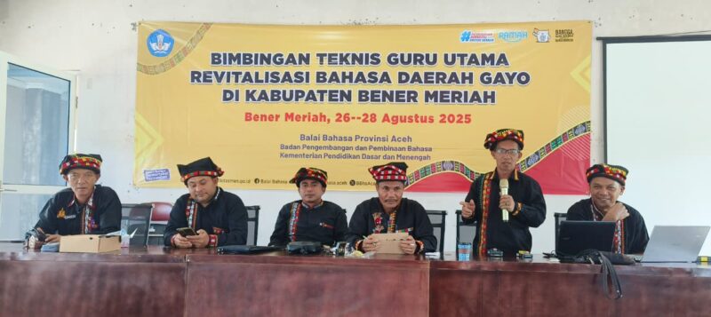Bener Meriah – Dinas Pendidikan Kabupaten Bener Meriah bersama Balai Bahasa Provinsi Aceh kembali menggelar bimbingan teknis (Bimtek) bagi sejumlah guru utama dalam rangka revitalisasi bahasa daerah Gayo pada tahun 2025. Kegiatan yang digelar mulai Selasa (26/8/2025) ini berlangsung selama tiga hari hingga Kamis (28/8/2025) dan diikuti sekitar 50 guru dari berbagai sekolah tingkat SD/MI dan SMP/MTsN di kabupaten tersebut.