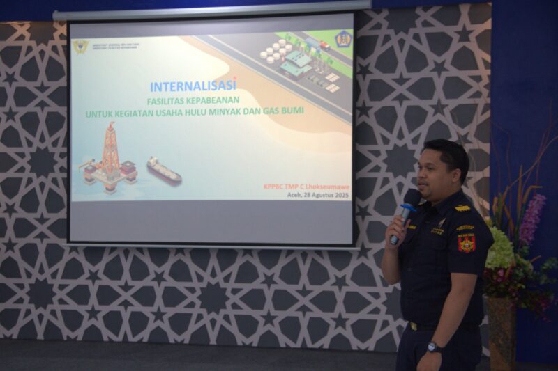 Lhokseumawe – Bea Cukai Lhokseumawe bersama Kantor Wilayah Bea Cukai Aceh menyelenggarakan kegiatan “Internalisasi dan Sosialisasi Petunjuk Teknis Monitoring dan Evaluasi Pemberian Fasilitas Pembebasan Bea Masuk dan/atau Tidak Dipungut PDRI atas Impor Barang untuk Kegiatan Usaha Hulu Minyak dan Gas Bumi”, Kamis (28/8/2025) di Aula Samudera Pasee, Kantor Bea Cukai Lhokseumawe.