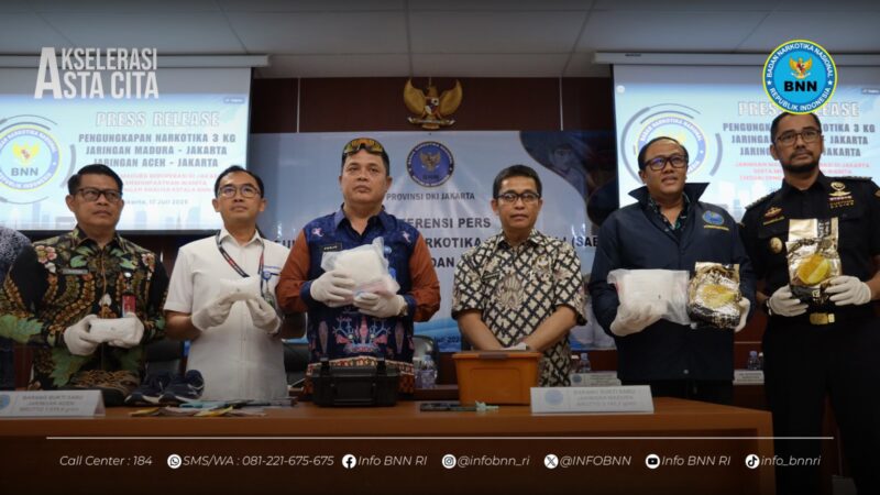 Jakarta — Badan Narkotika Nasional (BNN) Provinsi DKI Jakarta kembali menunjukkan komitmennya dalam memerangi peredaran gelap narkotika di Ibu Kota. Dalam konferensi pers yang digelar di kawasan Gambir, Jakarta Pusat, Kamis (17/7), BNN mengungkap dua kasus besar yang melibatkan tujuh tersangka dan mengamankan lebih dari 3 kilogram sabu.