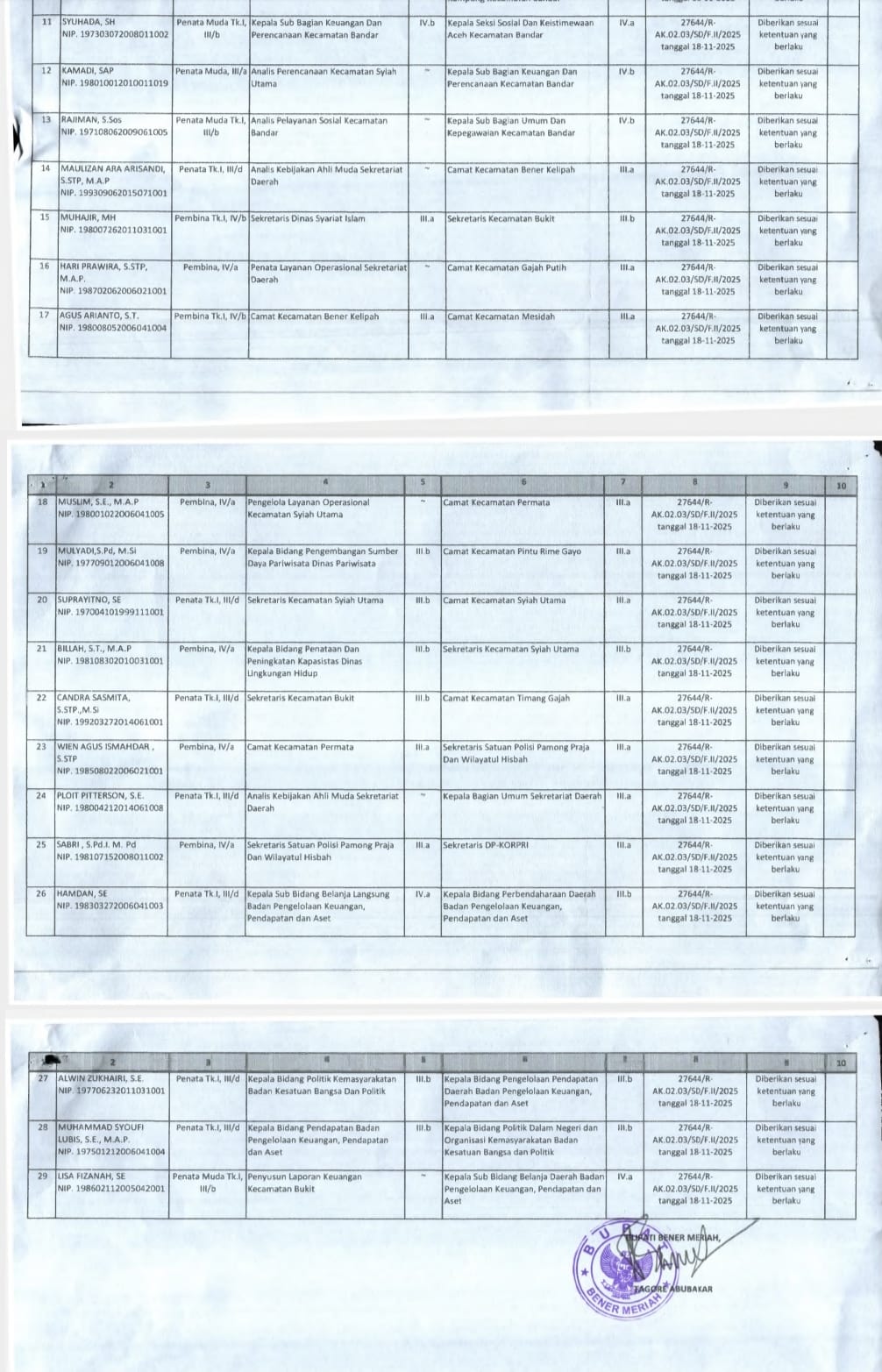 Sementara itu, berdasarkan salinan keputusan yang diterima dari Kepala Badan Kepegawaian Pendidikan dan Pelatihan Kabupaten Bener Meriah, Sukur, S.Pd., M.Pd., mutasi tersebut dilakukan berdasarkan Keputusan Bupati Bener Meriah Nomor: Peg.821/44/Ktsp/2026 tentang Pengangkatan dan Pemberhentian Pejabat Administrator dan Pengawas di Lingkungan Pemerintah Kabupaten Bener Meriah.