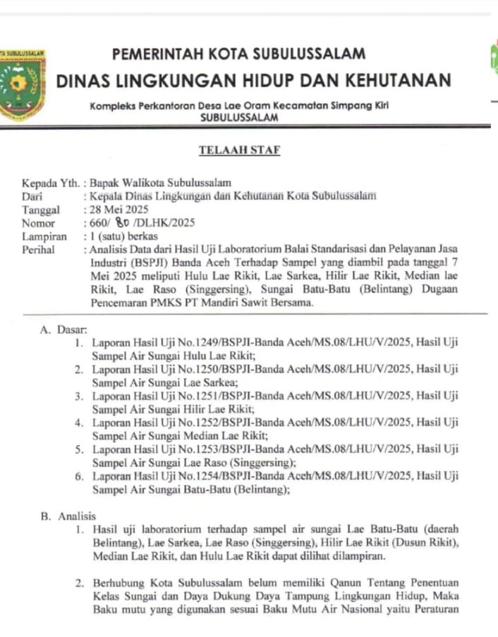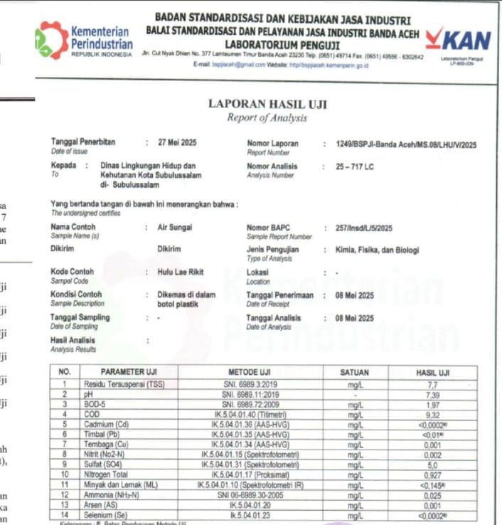 Fakta tersebut diperkuat dengan adanya surat resmi LTPKL bernomor 011/DTK-USK/LTPKL/2025 yang dikirimkan kepada DLHK Subulussalam. Dalam surat itu dinyatakan secara tegas bahwa uji laboratorium belum dilakukan secara menyeluruh, terutama terhadap dugaan pencemaran dari aktivitas industri PT MSB II. Dengan demikian, pernyataan DLHK yang mengklaim air sungai aman dinilai tidak berdasar dan belum melalui proses ilmiah yang tuntas.
