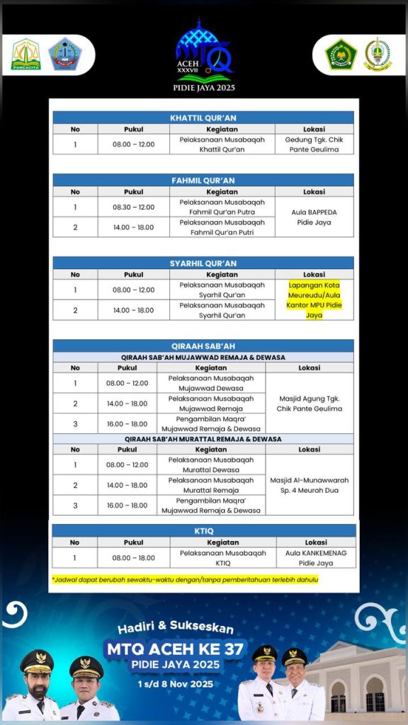 Pidie Jaya — Pelaksanaan Musabaqah Tilawatil Qur’an (MTQ) Aceh ke-37 terus berlanjut dengan antusiasme tinggi dari seluruh kafilah peserta. Memasuki hari keempat, pada Selasa (4/11/2025), panitia pelaksana merilis jadwal lengkap perlombaan untuk berbagai cabang yang akan digelar di sejumlah lokasi di Kabupaten Pidie Jaya. Beragam kategori lomba yang mencerminkan kemahiran dalam membaca, menulis, memahami, dan menghafal Al-Qur’an dijadwalkan berlangsung sejak pagi hingga malam hari secara paralel.
