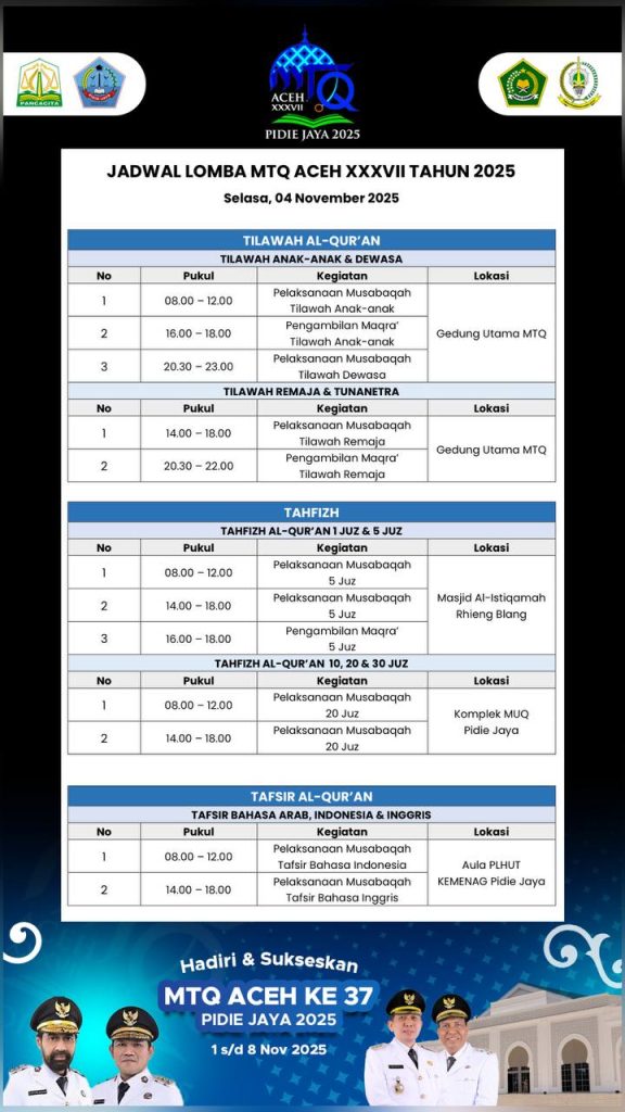 Pidie Jaya — Pelaksanaan Musabaqah Tilawatil Qur’an (MTQ) Aceh ke-37 terus berlanjut dengan antusiasme tinggi dari seluruh kafilah peserta. Memasuki hari keempat, pada Selasa (4/11/2025), panitia pelaksana merilis jadwal lengkap perlombaan untuk berbagai cabang yang akan digelar di sejumlah lokasi di Kabupaten Pidie Jaya. Beragam kategori lomba yang mencerminkan kemahiran dalam membaca, menulis, memahami, dan menghafal Al-Qur’an dijadwalkan berlangsung sejak pagi hingga malam hari secara paralel.