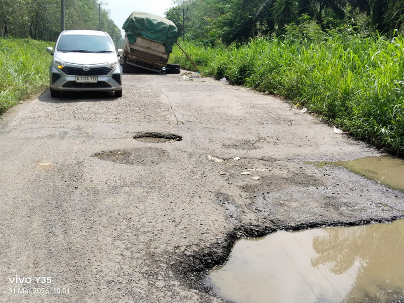 OGAN ILIR, 31 Maret 2026 — Kondisi jalan berlubang di ruas Tanjung Raja–Muara Kuang, Kabupaten Ogan Ilir, Sumatera Selatan, kembali menimbulkan persoalan serius bagi pengguna jalan. Pada Selasa (31/3/2026), sebuah truk bermuatan pupuk kandang mengalami kerusakan berat setelah melintasi jalan yang dipenuhi lubang di depan kawasan PT Perkebunan Karet Beriang, Desa Tanjung Temiang, Kecamatan Tanjung Raja. Gardan truk patah dan roda mengalami kerusakan parah, sehingga kendaraan nyaris terbalik dan harus ditahan menggunakan kayu sembari menunggu bantuan mekanik.