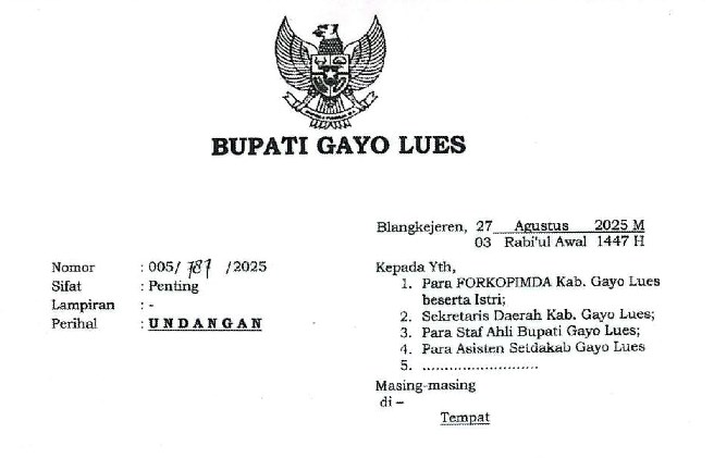 Undangan resmi terkait kegiatan tersebut tertuang dalam surat bernomor 005/1686 tertanggal 27 Agustus 2025 bertepatan dengan 23 Rabiul Awal 1447 Hijriah. Surat undangan itu ditandatangani langsung oleh Bupati Gayo Lues,, serta dibubuhi cap resmi dan lambang daerah.
