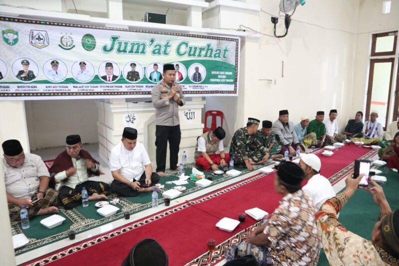 Kutacane – Kapolres Aceh Tenggara bersama Forum Komunikasi Pimpinan Daerah (Forkopimda) menggelar kegiatan Jumat Curhat di Masjid Jami’ Al-Ikhlas, Desa Penungkunen, Kecamatan Ketambe, Kabupaten Aceh Tenggara, pada Jumat (26/9/2025) sekira pukul 05.03 WIB.