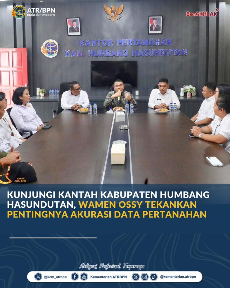 Sumatera Utara – Wakil Menteri Agraria dan Tata Ruang/Wakil Kepala Badan Pertanahan Nasional (Wamen ATR/Waka BPN), Ossy Dermawan, menegaskan bahwa data pertanahan yang akurat menjadi kunci utama menyelesaikan berbagai persoalan pertanahan sekaligus meningkatkan kualitas pelayanan bagi masyarakat. Saat memberikan pengarahan di Kantor Pertanahan Kabupaten Humbang Hasundutan, Sumatera Utara pada Rabu (01/04/2026), Wamen Ossy mengimbau agar pembenahan data dilakukan secara bertahap dan berkelanjutan sebagai fondasi utama sistem pertanahan.