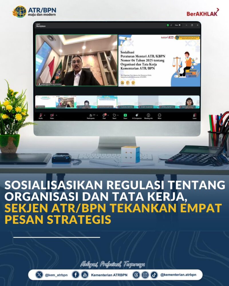 Jakarta – Sekretaris Jenderal (Sekjen) Kementerian Agraria dan Tata Ruang/Badan Pertanahan Nasional (ATR/BPN), Dalu Agung Darmawan, menegaskan empat pesan bagi jajaran pusat dan daerah dalam Webinar Nasional Sosialisasi Peraturan Menteri ATR/Kepala BPN Nomor 6 Tahun 2025 tentang Organisasi dan Tata Kerja Kementerian ATR/BPN, yang berlangsung pada Kamis (12/03/2026). Pesan tersebut mencakup pemahaman mendalam terhadap regulasi, penyesuaian pelaksanaan tugas dan fungsi, penguatan koordinasi antar unit kerja, serta pemanfaatan regulasi sebagai pedoman peningkatan kualitas layanan pertanahan.