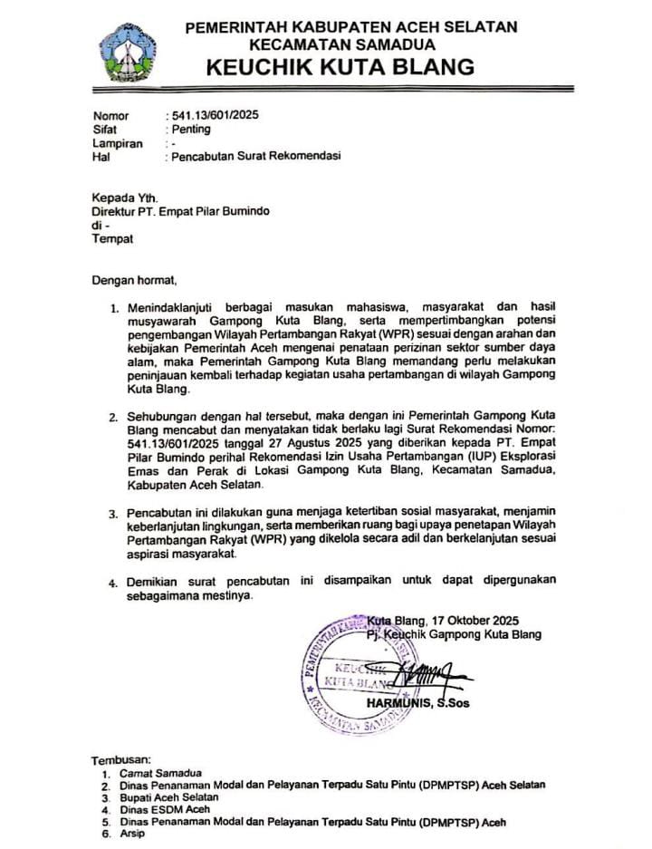 Surat pencabutan tersebut ditembuskan kepada Camat Samadua, Dinas Penanaman Modal dan Pelayanan Terpadu Satu Pintu (DPMPTSP) Aceh Selatan, Bupati Aceh Selatan, Dinas ESDM Aceh, serta DPMPTSP Aceh sebagai bentuk laporan resmi dan penegasan sikap Pemerintah Gampong Kuta Blang terhadap izin eksplorasi tambang di wilayahnya. *