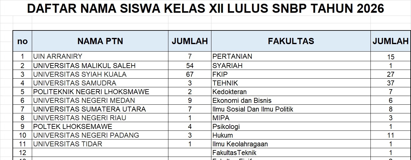 Selain itu, siswa juga diterima di Universitas Samudra Langsa sebanyak 3 orang, Universitas Negeri Padang 3 orang, Politeknik Negeri Lhokseumawe 6 orang, Universitas Negeri Riau 1 orang, dan Universitas Tidar 1 orang.