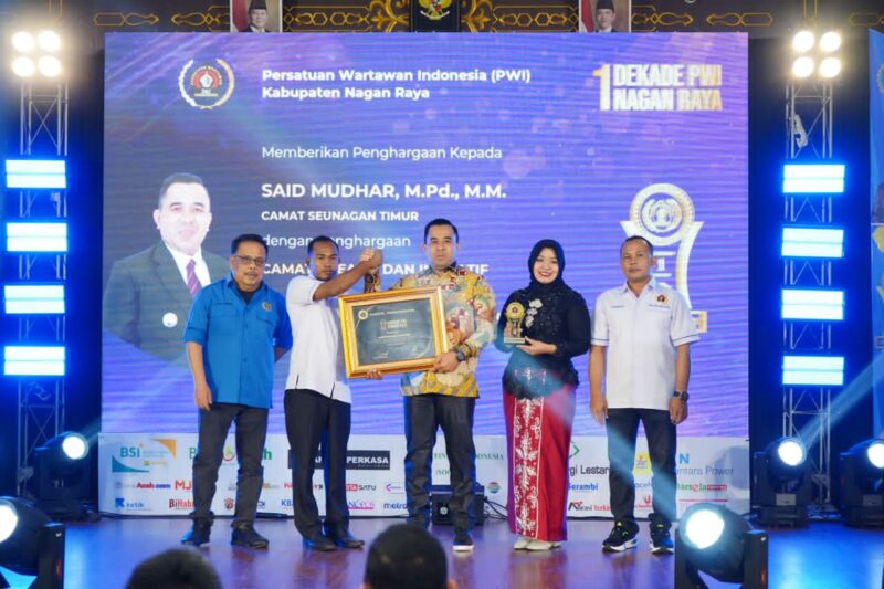Camat Seunagan Timur Said Mudhar, M.Pd.,MM raih penghargaan dari persatuan wartawan Indonesia (PWI) Kabupaten Nagan Raya kategori Camat inovatif dan kreatif pada acara malam puncak 1 Dekade PWI Nagan Raya yang di laksanakan di anjungan pendopo Bupati Nagan Raya.