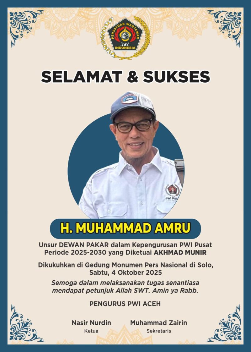 BANDA ACEH, BARANEWS — Tokoh asal Aceh, H. Muhammad Amru, resmi dikukuhkan sebagai anggota Dewan Pakar Persatuan Wartawan Indonesia (PWI) Pusat periode 2025–2030 dalam sebuah upacara pelantikan di Gedung Monumen Pers Nasional, Solo, Sabtu (4/10/2025). Pelantikan ini berlangsung bersamaan dengan pengukuhan kepengurusan baru PWI Pusat yang kini dipimpin oleh Akhmad Munir sebagai Ketua Umum.