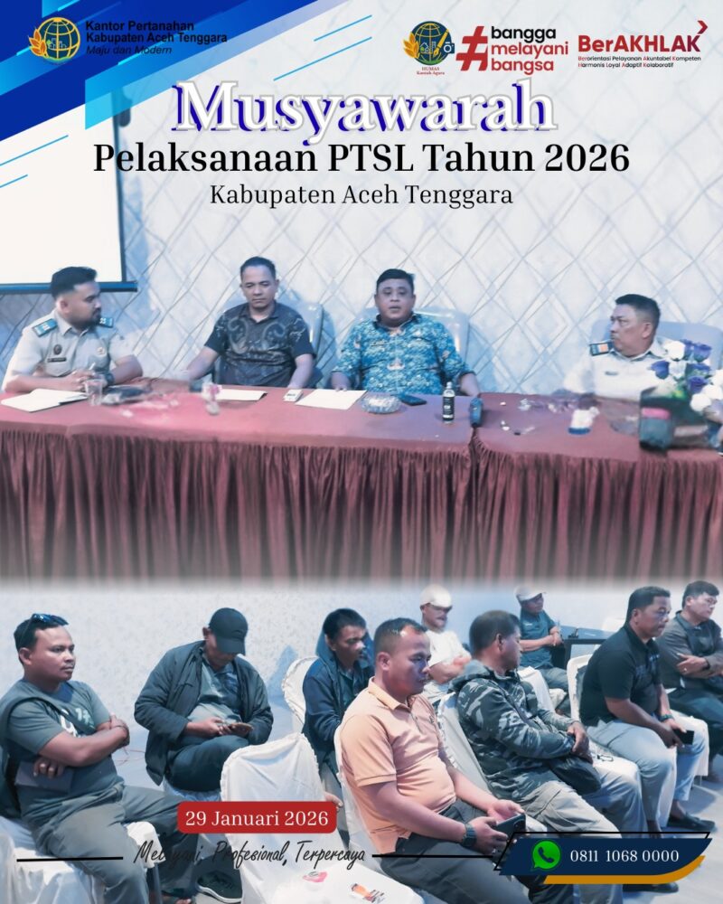 Dalam rangka menyukseskan Program Pendaftaran Tanah Sistematis Lengkap (PTSL) Tahun Anggaran 2026, Kantor Pertanahan Kabupaten Aceh Tenggara melaksanakan kegiatan musyawarah dengan Kepala Desa. Kegiatan ini menjadi langkah awal yang sangat penting dalam memastikan pelaksanaan PTSL berjalan tertib, transparan dan sesuai ketentuan yang berlaku.
