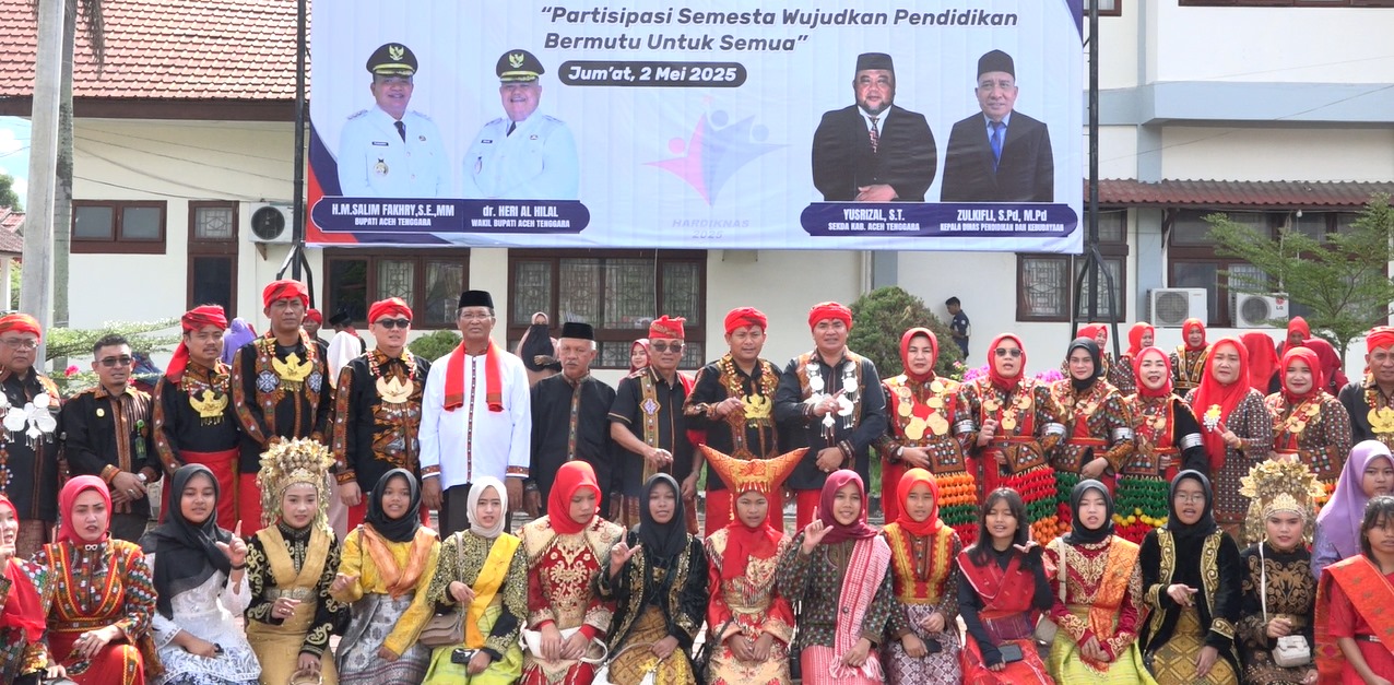 Kutacane_Memperingati Hari Pendidikan Nasional (Hardiknas), dengan mengangkat tema “Partisipasi Semesta Wujudkan Pendidikan Bermutu Untuk Semua”. Pemerintah Kabupaten Aceh Tenggara balut Hardiknas dengan nuansa adat dari 11 etnis yang ada di Aceh Tenggara. Jumat (2/5/2025).