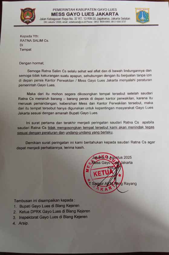 Jakarta — 2 Agustus 2025 |  Pemerintah Kabupaten Gayo Lues melalui pengurus Mess Gayo Lues Jakarta melayangkan surat peringatan kepada seorang warga bernama Ratna Salim Cs yang diduga telah menggunakan area depan Mess Gayo Lues Jakarta untuk berjualan tanpa izin.