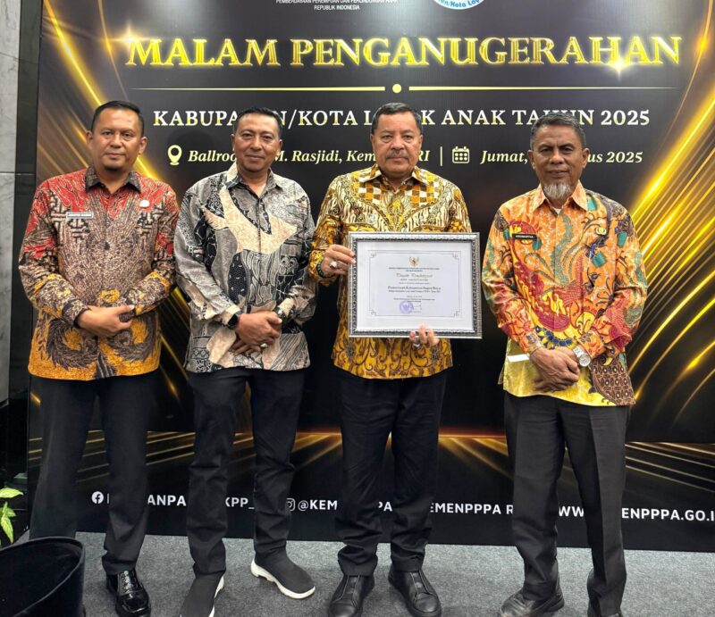 Penghargaan tersebut diserahkan langsung oleh Wakil Menteri PPPA, Veronica Tan, dan diterima oleh Bupati Nagan Raya, Dr. Teuku Raja Keumangan, S.H., M.H., pada acara Malam Penganugerahan Kabupaten/Kota Layak Anak Tahun 2025 yang berlangsung di Auditorium KH. M. Rasjidi, Kementerian Agama RI, Jalan MH Thamrin No. 6, Jakarta Pusat, Jumat (8/8/2025) malam.