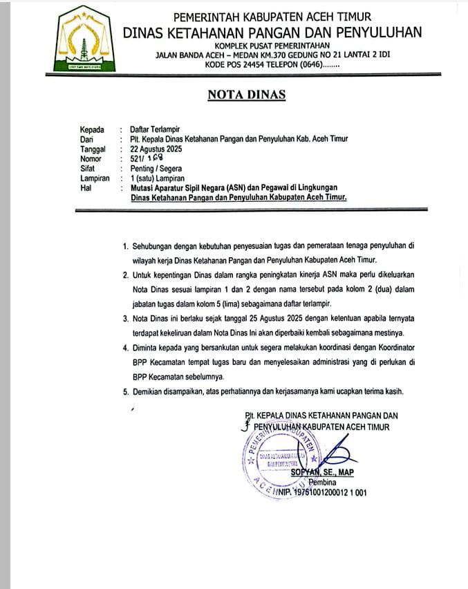 Aceh Timur | Sesuai dengan keputusan Badan Kepegawaian Negara (BKN), Pelaksana Tugas (PLT) Kepala Dinas tidak memiliki kewenangan untuk memindahkan Penyuluh Pertanian Lapangan (PPL) dari satu tempat tugas ke tempat lainnya. Keputusan tersebut menegaskan bahwa kewenangan mutasi pegawai hanya dapat dilakukan oleh pejabat definitif sesuai aturan kepegawaian yang berlaku.Idi, 27 Agustus 2025.