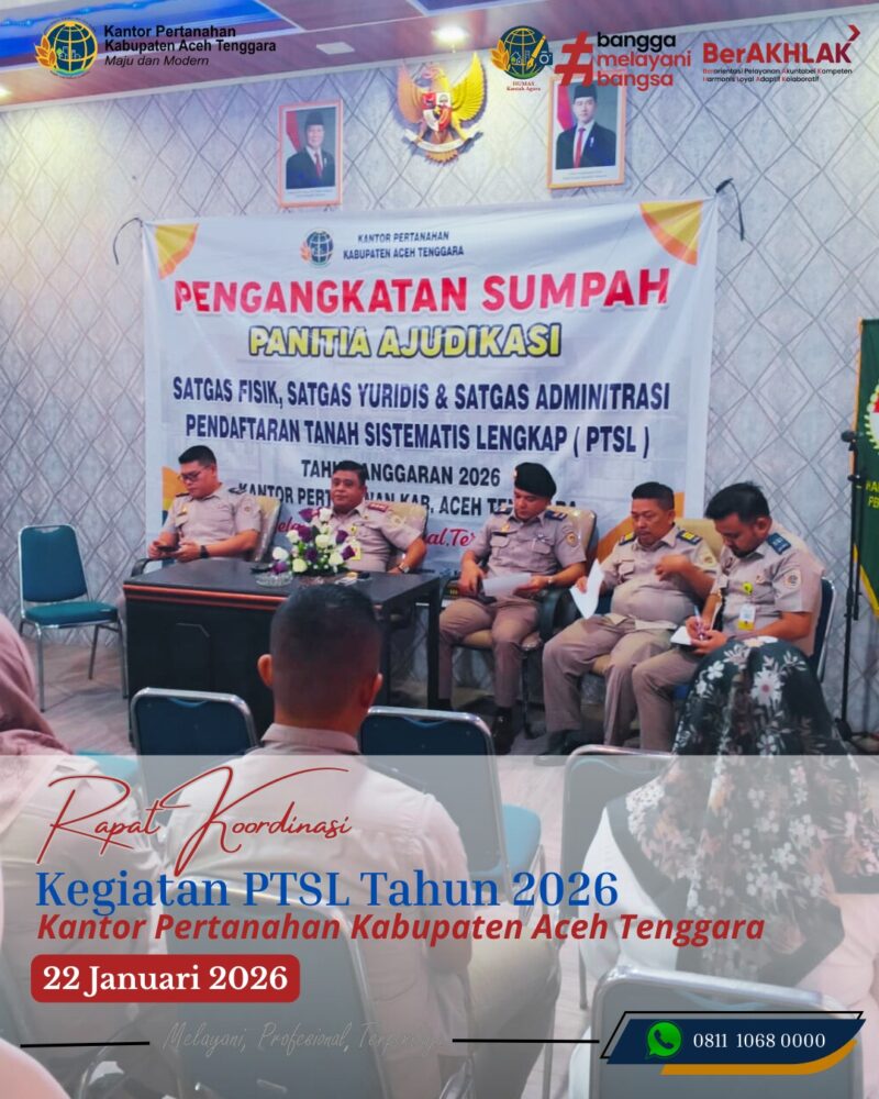 Kantor Pertanahan Kabupaten Aceh Tenggara melaksanakan Rapat Koordinasi kegiatan Program Pendaftaran Tanah Sistematis Lengkap (PTSL) Tahun 2026 bersama Tim Satgas PTSL dan perangkat desa peserta PTSL Tahun 2026.