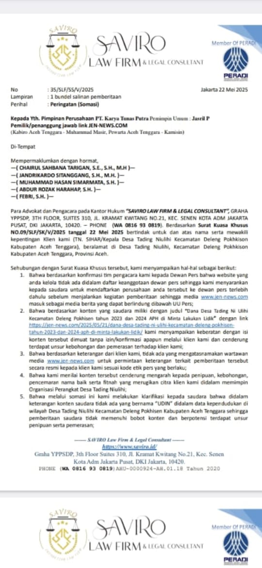 Gayo Lues – | 25 Mei 2025 – Redaksi Jennews.com dan DetikNews.id secara resmi menyampaikan tanggapan atas somasi dari Saviro Law Firm & Legal Consultant bernomor 35/SLF/55/V/2025 yang dilayangkan terkait pemberitaan mengenai penggunaan Dana Desa di Kecamatan Deleng Pokhisen.