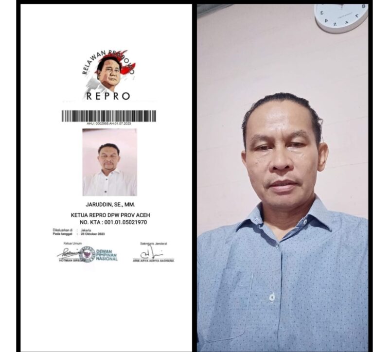 Sebagai informasi, Jaruddin, SE., MM., secara resmi menjabat sebagai Ketua DPW REPRO Provinsi Aceh berdasarkan Surat Keputusan KTA: 001.01.05021970 yang diterbitkan oleh Dewan Pimpinan Nasional Relawan Prabowo (REPRO) pada 28 Oktober 2023 di Jakarta.