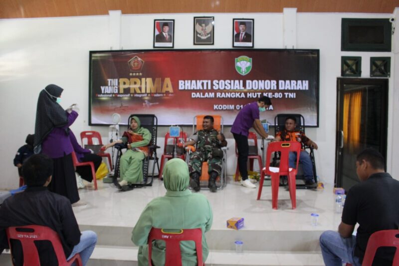ABDYA | Kodim 0110/Abdya menggelar bhakti sosial donor darah sebagai rangkaian dalam menyambut peringatan Hari Ulang Tahun (HUT) ke-80 TNI, berlangsung di aula Makodim setempat, Desa Keude Paya Kecamatan Blangpidie, Minggu (21/9/2025).