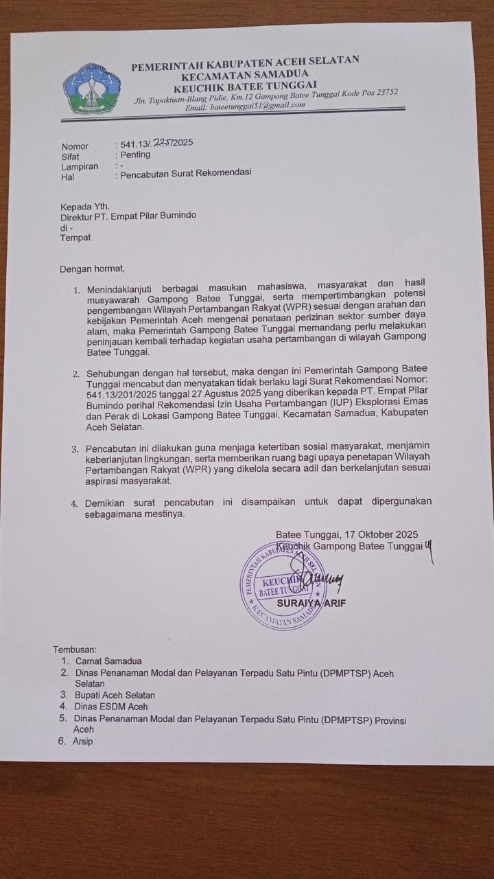 Keputusan tersebut tertuang dalam Surat Keuchik Gampong Batee Tunggai Nomor 541.13/237/2025 tertanggal 17 Oktober 2025, tentang Pencabutan Surat Rekomendasi kepada PT Empat Pilar Bumindo.