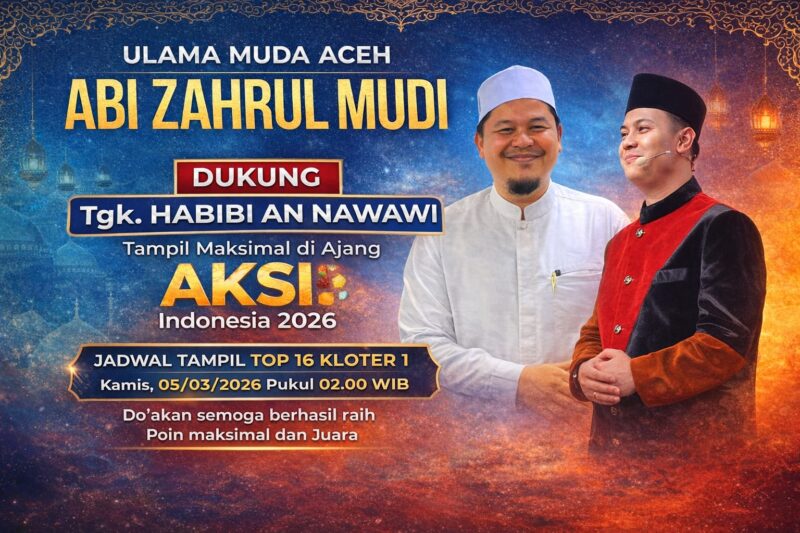 Sebagaimana diketahui, Tgk. Habibi telah masuk Top 16 dan akan tampil malam ini di Kloter 1 pukul 02.00 WIB. Masyarakat Aceh pun berharap, langkahnya di panggung AKSI 2026 menjadi momentum kebangkitan semangat dakwah generasi muda — dari Aceh untuk Indonesia.