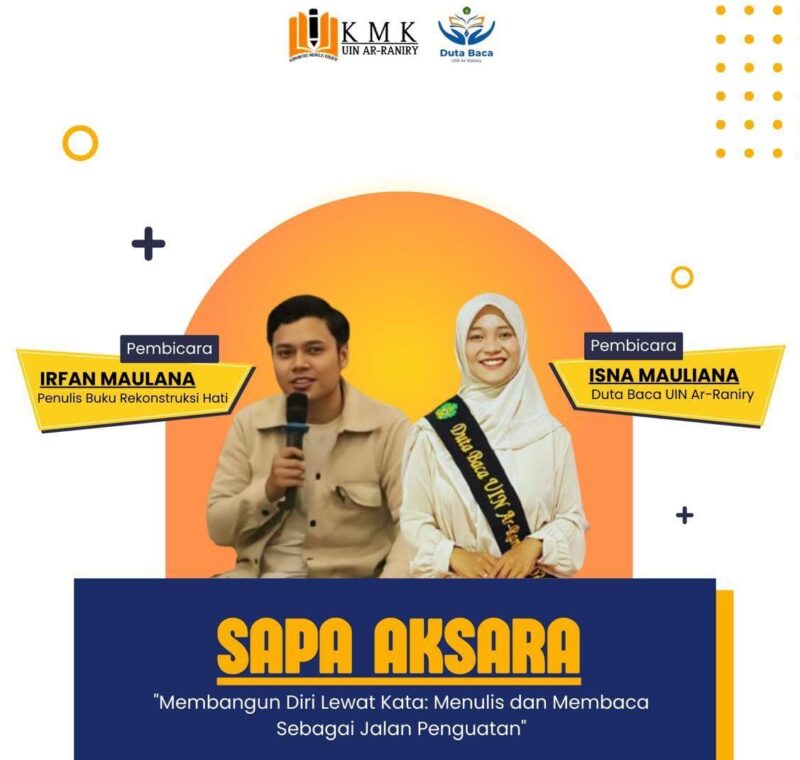 Kegiatan ini menghadirkan narasumber utama, Irfan Maulana Penulis Buku “Rekonstruksi Hati” dan Isna Mauliana Duta Baca UIN Ar-Raniry, yang telah menginspirasi banyak penulis dan pembaca muda melalui karya dan peran aktifnya di dunia literasi.